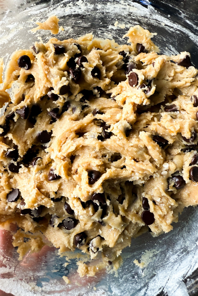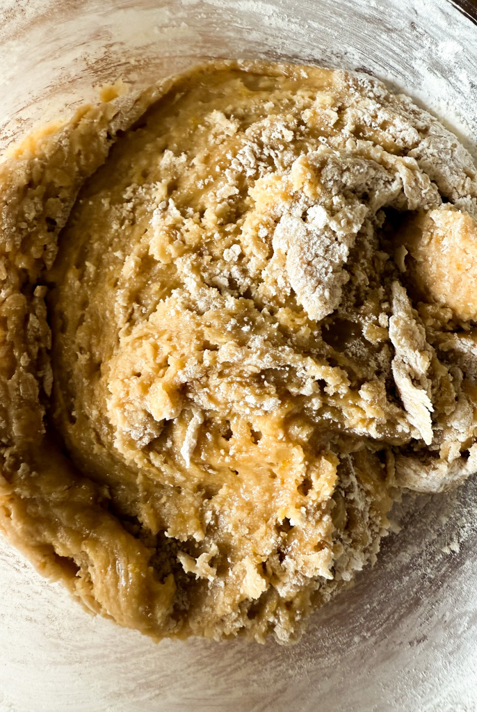 - Mix your dry ingredients together in a separate bowl and add them into your butter and sugar mixture. Mix until just combined, with some loose flour still present (see pictures). Do not overmix! Overmixing can cause cookies to become dense and flat when baking.