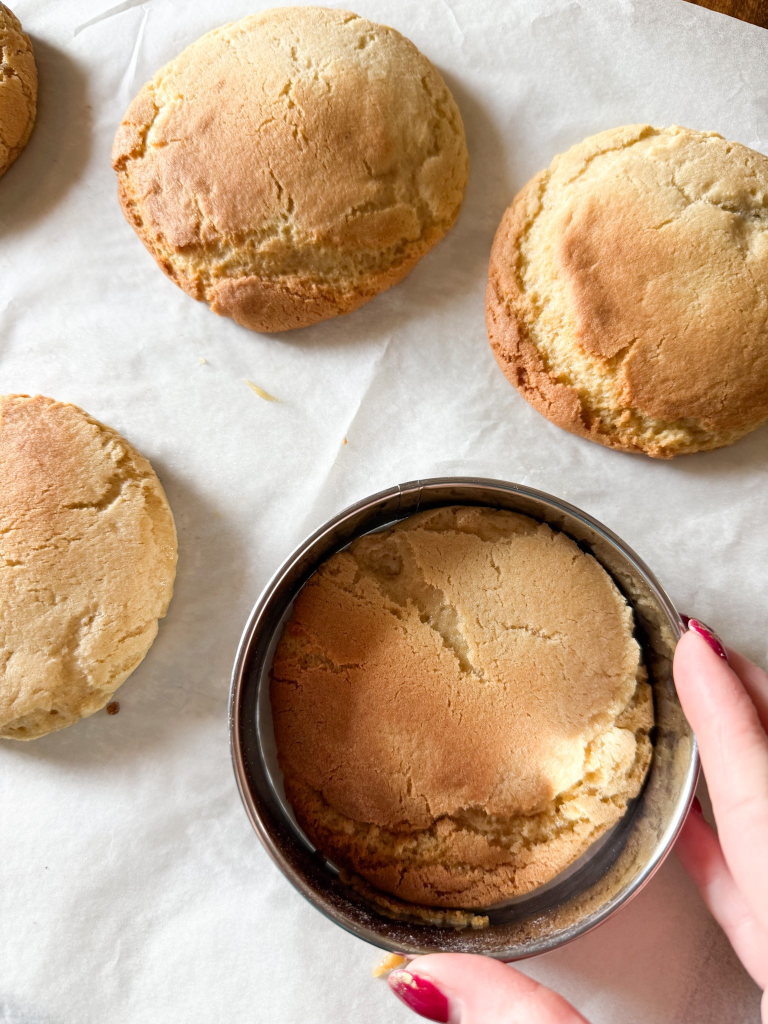 - Place large cookie dough balls several inches apart, as cookie will spread a little while baking. Bake cookies at 350 degrees for 11-12 minutes. When cookies are removed from the oven, you can shape cookies into perfect circles using a large glass or large round cookie cutter by swirling the glass around the edges of the cookie.