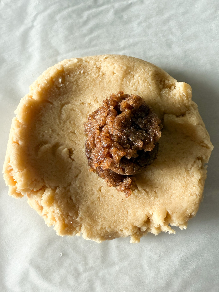 - Scoop cookie dough into large balls. I use a #40 cookie scoop and combine two dough balls, which is 1.5 oz of cookie dough. Press ball of cookie dough into disc. Scoop 1/2 tablespoon of brown sugar filling and place in the center of the dough ball disc. Fold dough edges up around the filling, pinch the seams together, and roll dough until smooth. Filing should be fully wrapped in the cookie dough.