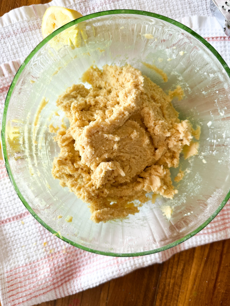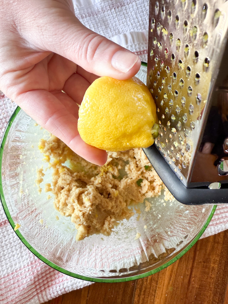 • Add in eggs and lemon extract. Zest and squeeze your lemon. Add all the zest from one lemon into the cookie dough, and add 2 tbsp of lemon juice (about the amount from 1 small lemon). Mix until combined.