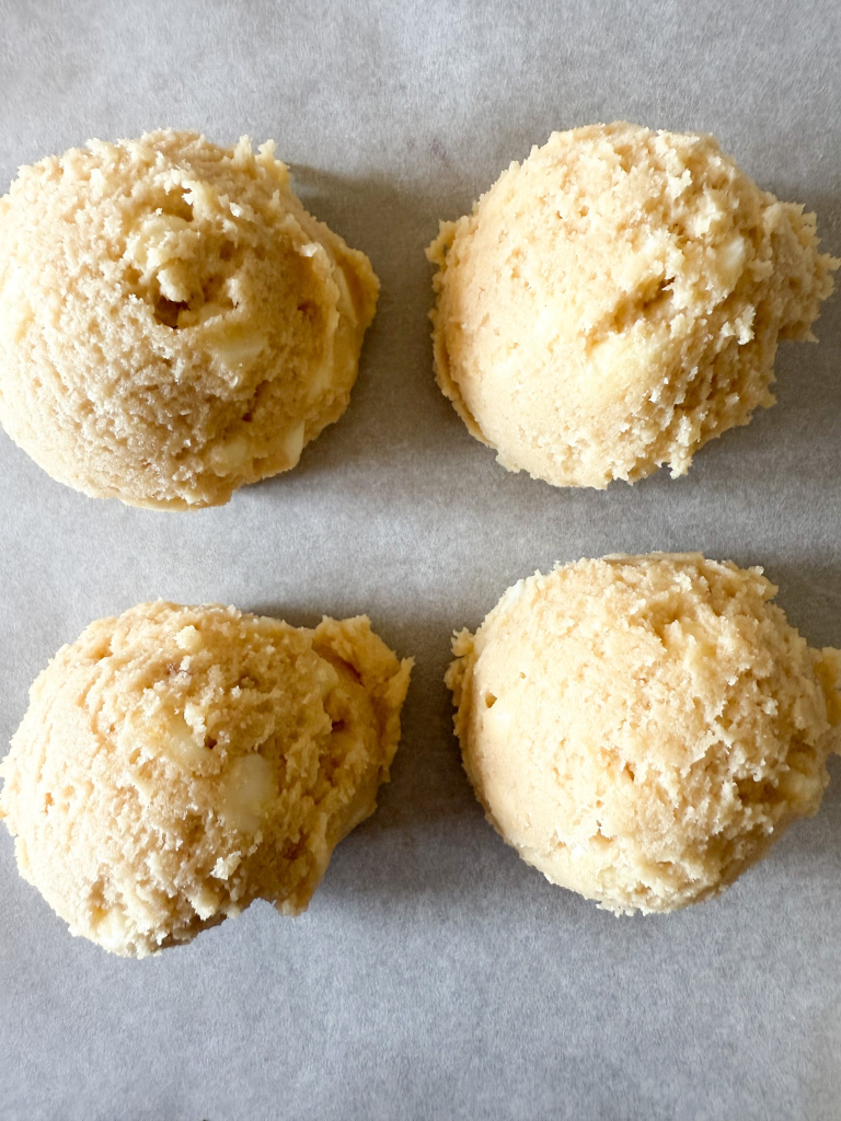 • Evenly space your 5 dough balls on the cookie sheet, bake for 11-13 minutes. Edges should be golden brown when you take the cookies out, but the center should still be glossy. This results in a super chewy cookie that stays soft for days!