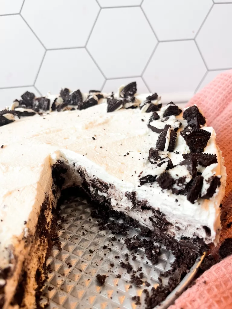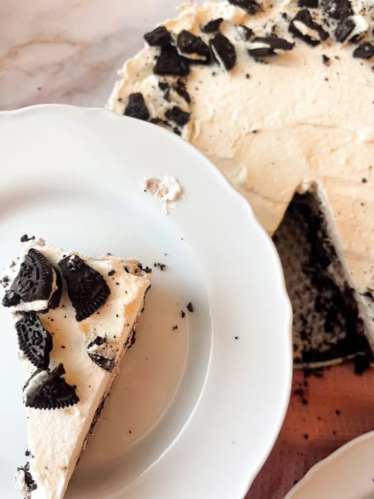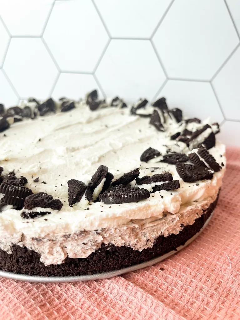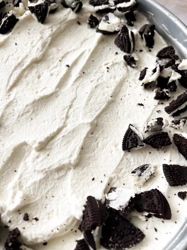 - Top the cheesecake with remaining whipped cream and extra crushed Oreos. Refrigerate for 2 hours before serving. Enjoy!