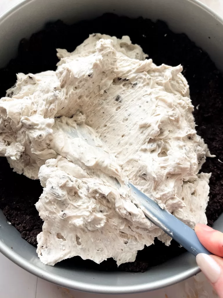 - Take your Oreo crust out of the fridge. Pour your cream cheese mixture into the pie crust and evenly spread.