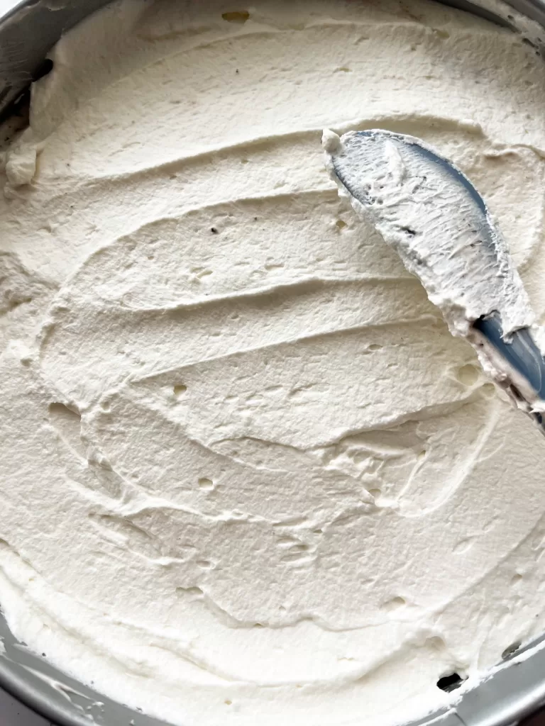 - In a separate bowl, add 2 cups cold whipping cream, 1 cup powdered sugar, and vanilla. Mix on high speed to aerate the cream. Continue beating until peaks form and hold their shape. Do not overmix or you’ll turn your cream to butter!