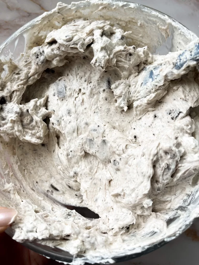 - Using an electric mixer, beat the two bricks of cream cheese and 3/4 cup powdered sugar in a mixing bowl until light and fluffy. Add approximately 20 Oreos into the cream cheese mixture, coarsely crushing the Oreos as you add them in. Using the electric mixer, beat Oreos into cream cheese mixer. Leaving large chunks of Oreos is totally fine! It’ll add some extra texture to the cheesecake.