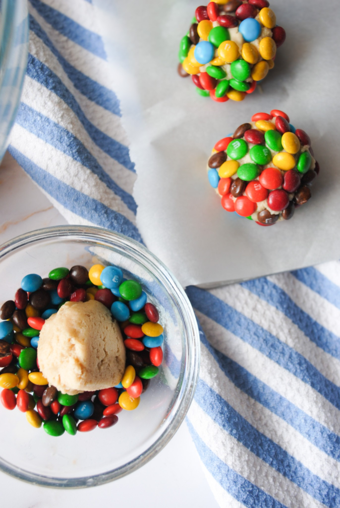 - Roll dough in mini M&Ms, covering the top and edges of dough with M&Ms.